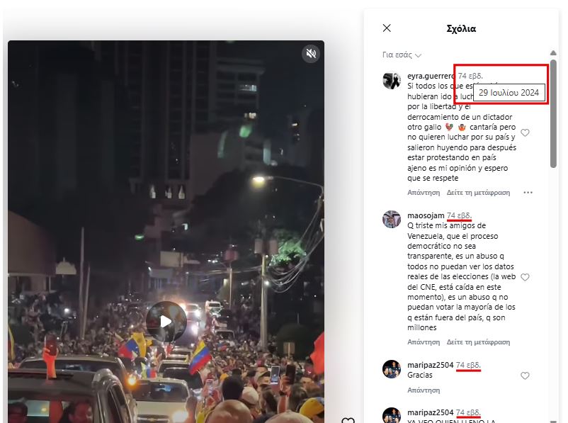 Το συμπέρασμα των ελληνικών hoaxes; «Το υπό εξέταση βίντεο δεν είναι πρόσφατο. Απεικονίζει διαδηλώσεις εναντίον του προέδρου της Βενεζουέλας, Nicolás Maduro, οι οποίες έλαβαν χώρα τον Ιούλιο του 2024 από Βενεζουελάνους που ζουν στον Παναμά. Το ίδιο βίντεο έχει χρησιμοποιηθεί παραπλανητικά και στο παρελθόν, τον Αύγουστο του 2025, όταν η κυβέρνηση των Ηνωμένων Πολιτειών αύξησε την αμοιβή για τη σύλληψη του Maduro στα 50 εκατομμύρια δολάρια».