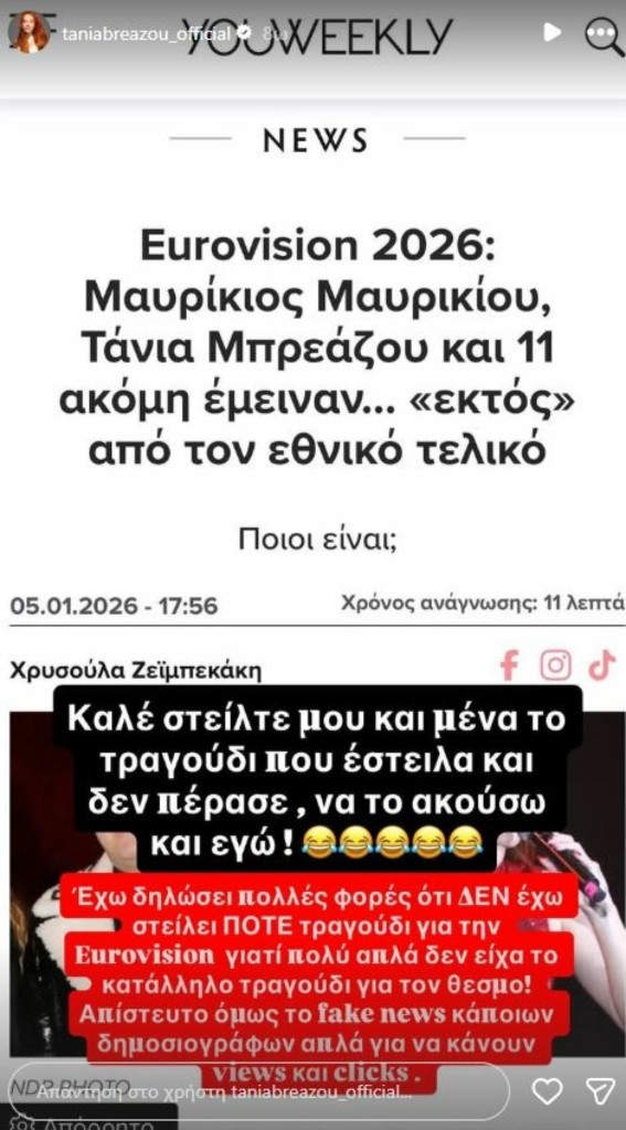 Στη συνέχεια, ξεκαθάρισε ότι μην έχοντας βρει το ιδανικό κομμάτι για τον διαγωνισμό τραγουδιού, δεν προχώρησε ποτέ σε δήλωση συμμετοχής. «Έχω δηλώσει πολλές φορές ότι δεν έχω στείλει ποτέ τραγούδι για τη Eurovision γιατί πολύ απλά δεν είχα το κατάλληλο τραγούδι για τον θεσμο! Απίστευτο όμως το fake news κάποιων δημοσιογράφων απλά για να κάνουν views και clicks», σημείωσε.