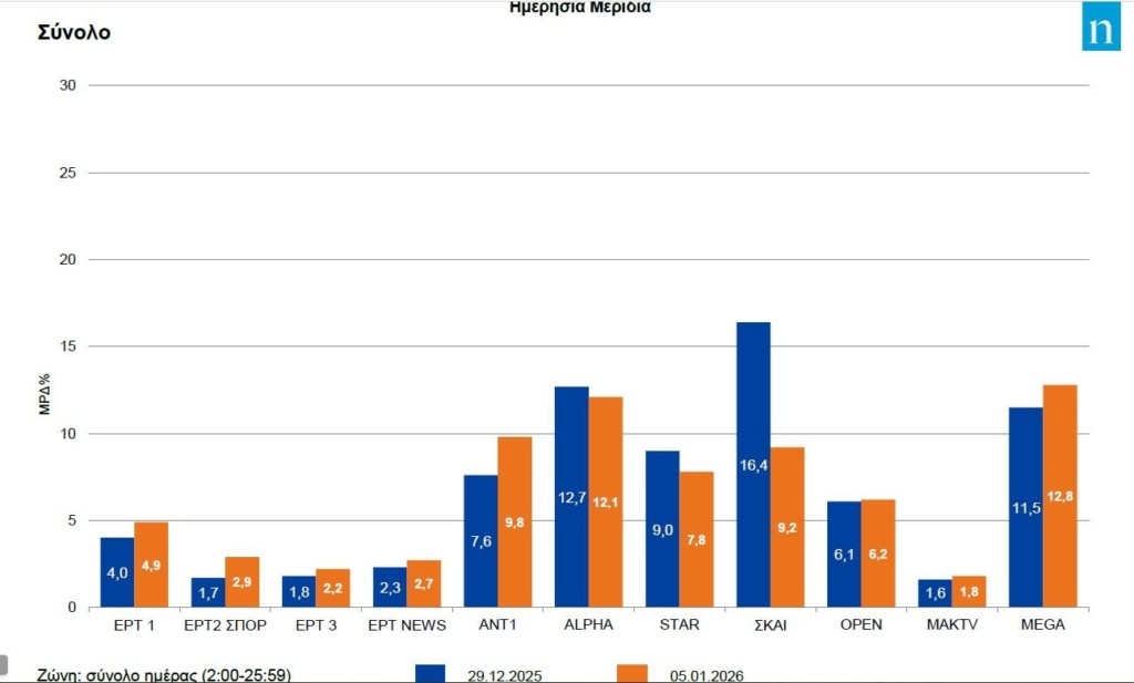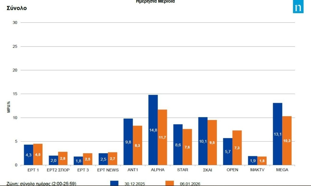 Με εξαίρεση τα κανάλια της ΕΡΤ τα οποία, όπως φαίνεται και από τις μετρήσεις της Nielsen, έχουν το δικό τους κοινό, στον υπόλοιπο ανταγωνισμό διαμορφώθηκαν κυρίως πτωτικές τάσεις τηλεθέασης με εξαίρεση τον ΣΚΑΪ και το Open που είχε και την μεγαλύτερη μεταβολή στο μερίδιο του (+1,1%) από τη μία ημέρα στην επόμενη.