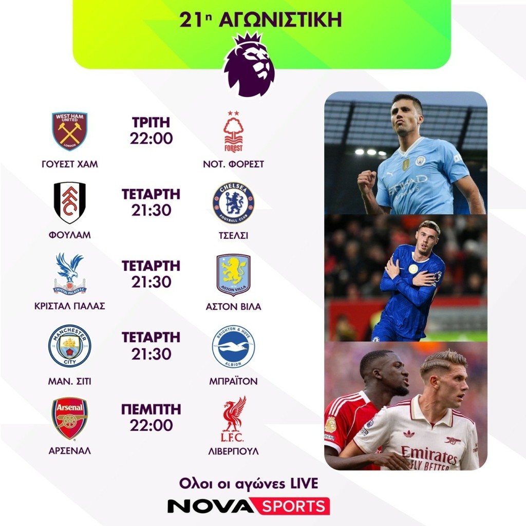 H Premier League, το κορυφαίο πρωτάθλημα στον κόσμο και τη φωνή του Χρήστου Σωτηρακόπουλου στα κανάλια Novasports, συνεχίζεται με την 21η αγωνιστική που θα διεξαχθεί εμβόλιμα και όλα τα βλέμματα πέφτουν στο ντέρμπι Άρσεναλ – Λίβερπουλ (8/1, 22:00) ενώ ξεχωρίζουν και οι αναμετρήσεις Φούλαμ – Τσέλσι (7/1, 21:30), Μάντσεστερ Σίτι – Μπράιτον (7/1, 21:30), Μπέρνλι – Μάντσεστερ Γιουνάιτεντ (7/1, 22:15). Η Premier League θα πλαισιωθεί με τις εκπομπές «Premier League Kick Off» και «Premier League The Show» με τον Άγγελο Στυλιάδη και τον Γιώργο Σαμαρά.
