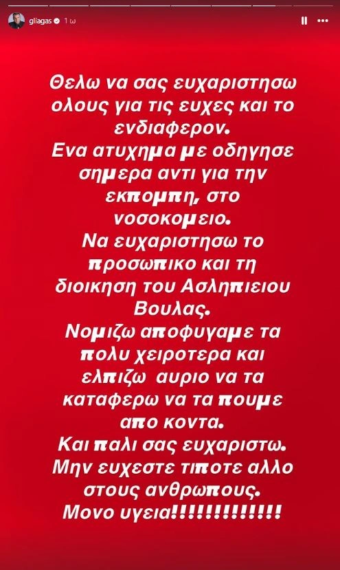 «Θέλω να σας ευχαριστήσω όλους για τις ευχές και το ενδιαφέρον. Ένα ατύχημα με οδήγησε σήμερα αντί για την εκπομπή, στο νοσοκομείο.