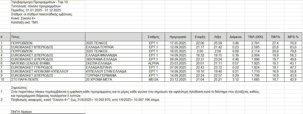 Παραξενεύει, ίσως, η επανεμφάνιση του διαγωνισμού τραγουδιού της Eurovision στην τρίτη θεση του Top 10 των εκπομπών με τις υψηλότερες επιδόσεις του 2025, υπάρχει όμως εξήγηση.