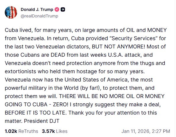 «ΔΕΝ ΘΑ ΥΠΑΡΞΕΙ ΑΛΛΟ ΠΕΤΡΕΛΑΙΟ Ή ΧΡΗΜΑΤΑ ΠΟΥ ΘΑ ΠΗΓΑΙΝΟΥΝ ΣΤΗΝ ΚΟΥΒΑ – ΜΗΔΕΝ! Προτείνω ανεπιφύλακτα ότι θα κάνουν μία συμφωνία, ΠΡΙΝ ΕΙΝΑΙ ΠΟΛΥ ΑΡΓΑ», έγραψε ο Τραμπ στην πλατφόρμα κοινωνικής δικτύωσης του, Truth Social.