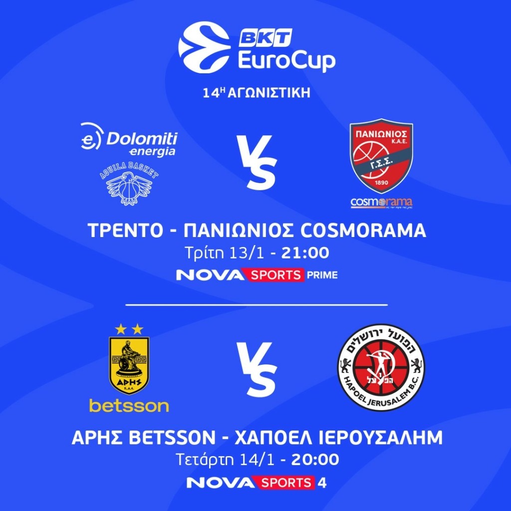 Το EuroCup συνεχίζεταιμε την 14η αγωνιστική οι συνδρομητές θα απολαύσουν τις αναμετρήσεις των δύο ελληνικών ομάδων, Τρέντο-Πανιώνιος Cosmorama Travel (13/1, 21:00) και Άρης Betsson-Χάποελ Ιερουσαλήμ (14/1, 20:00).