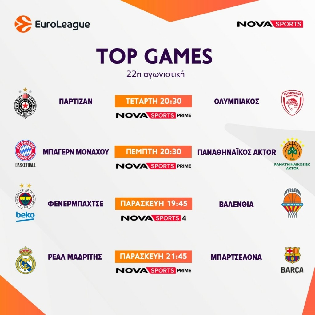 20:30 EuroLeague – 22η αγωνιστική: Παρτίζαν-Ολυμπιακός Novasports Prime σε περιγραφή του Νικήτα Αυγουλή