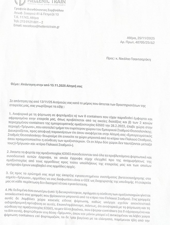 Έγγραφο σύμφωνα με το οποίο η εμπορική αμαξοστοιχία φορτώθηκε στο «Τρίγωνο» κατέθεσε ο δικηγόρος της Interstar, Βασίλης Καπερνάρος, προκαλώντας την έκρηξη των συγγενών των θυμάτων του σιδηροδρομικού δυστυχήματος των Τεμπών.