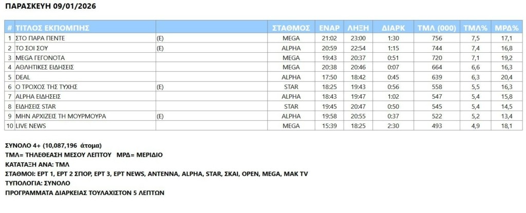 Με υψηλή επίδοση στην κορυφή της τηλεθέασης των καναλιών το Mega την Παρασκευή (9/1)
