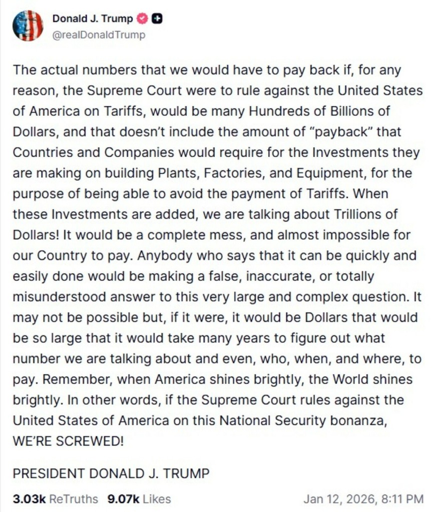 Οι ΗΠΑ «θα την πατήσουν» αν το Ανώτατο Δικαστήριο κρίνει παράνομους τους δασμούς που επέβαλε ο Αμερικανός πρόεδρος Ντόναλντ Τραμπ, όπως εκτίμησε ο ίδιος σήμερα σε ανάρτησή του, εν αναμονή της απόφασης που πρόκειται να εκδοθεί από μέρα σε μέρα.