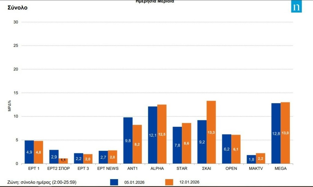 Κατά τα λοιπά, δεύτερη επιλογή των τηλεθεατών μέσα στη μέρα ήταν το Mega και τρίτη ο Alpha. Θετικό πρόσημο είχαν οι μεταβολές δεδομένων Star και ΑΝΤ1.