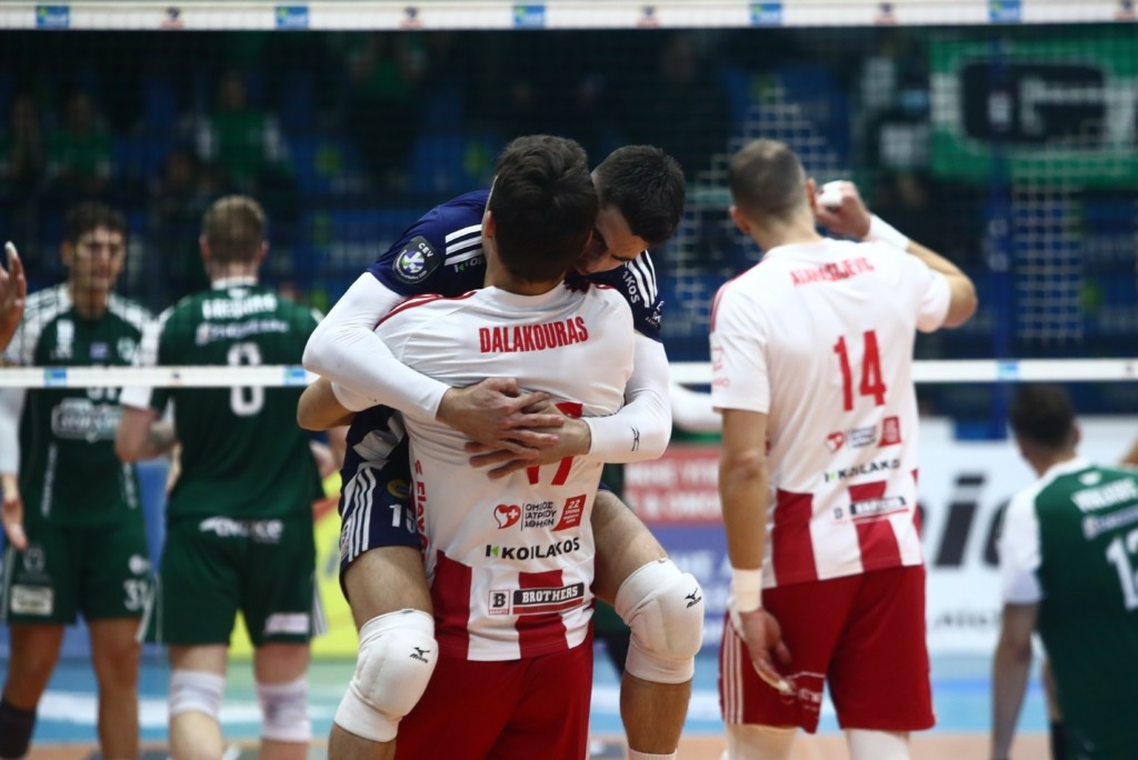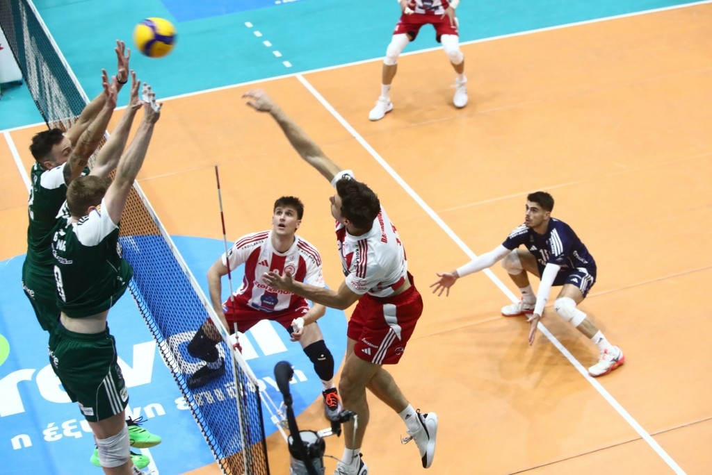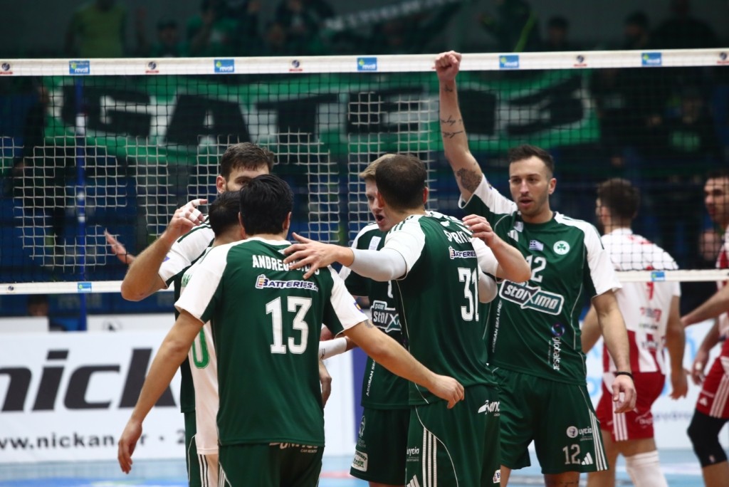 Ο Παναθηναϊκός «έσβησε» το καλό ξεκίνημα του Ολυμπιακού (1-3) και τις επιθέσεις του Ατανασίεβιτς στο πρώτο σετ και με «όπλο» του το σερβίς και το μπλοκ, κατάφερε να περάσει μπροστά με 9-7 (μπλοκ και επίθεση από Γκάσμαν). Οι «πράσινοι» ανέβασαν κι άλλο το προβάδισμά τους σε 13-8 με την άουτ επίθεση του Λινάρδου και άρχισαν να… ξεμακραίνουν κι άλλο απ’ τον άσσο του Γκάσμαν (16-10). Οι παίκτες του Δημήτρη Ανδρεόπουλου συντηρούσαν με ευκολία ένα προβάδισμα 4 έως 6 πόντων, παίρνοντας πόντους στην επίθεση κι από τον Βουλκίδη. Ο Ολυμπιακός μείωσε σε 20-19 με τον Δαλακούρα και τον Ατανασίεβιτς, όμως δύο λάθη του Σέρβου άσου των «ερυθρολεύκων» έφεραν τον Παναθηναϊκό στο 24-20 και στο κλείσιμο του σετ απ’ την επίθεση του Ανδρεόπουλου.