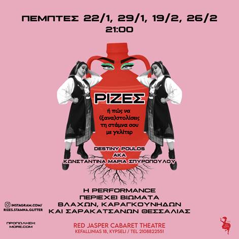 Η Κωνσταντίνα Μαρία Σπυροπούλου (drag persona Destiny Poulos) ρώτησε, έμαθε, της μίλησαν και τώρα καταθέτει στη σκηνή προσωπικά της βιώματα που σχετίζονται με τις Θεσσαλικές ρίζες της, καθώς και άλλων Βλάχων, Καραγκούνηδων και Σαρακατσάνων Θεσσαλίας. Μετά την επιτυχημένη πορεία της παράστασης το 2024, το κοινό θα έχει την ευκαιρία να την (ξανά) απολαύσει για 4 παραστάσεις αυτόν τον χειμώνα!