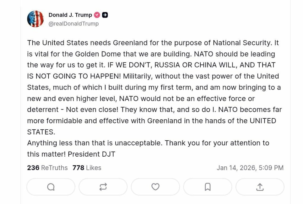 «Οι Ηνωμένες Πολιτείες χρειάζονται τη Γροιλανδία για λόγους εθνικής ασφάλειας. Είναι ζωτικής σημασίας για το Golden Dome που χτίζουμε. Το ΝΑΤΟ πρέπει να μας οδηγήσει στο να το αποκτήσουμε. ΑΝ ΔΕΝ ΤΟ ΚΑΝΟΥΜΕ ΕΜΕΙΣ, ΘΑ ΤΟ ΚΑΝΟΥΝ Η ΡΩΣΙΑ Ή Η ΚΙΝΑ, ΚΑΙ ΑΥΤΟ ΔΕΝ ΘΑ ΣΥΜΒΕΙ!