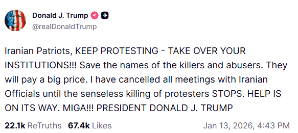 Ο Ντόναλντ Τραμπ, μέσω αναρτήσεων στην πλατφόρμα Truth Social και σε συνεντεύξεις του, κάλεσε ανοιχτά τους Ιρανούς πολίτες να «συνεχίσουν να διαδηλώνουν», διαμηνύοντας ότι «η βοήθεια είναι καθ’ οδόν», χωρίς ωστόσο να δώσει λεπτομέρειες.