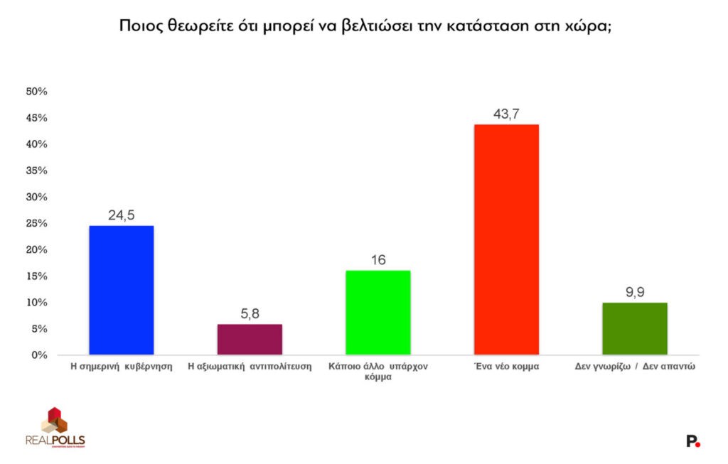 Όταν οι πολίτες ερωτώνται «ποιος μπορεί να βελτιώσει την κατάσταση στη χώρα», οι απαντήσεις είναι ενδεικτικές: Το 43,7% απαντά «ένα νέο κόμμα», το 24,5% η σημερινή κυβέρνηση, το 16% κάποιο άλλο υπάρχον κόμμα, και μόλις το 5,8% η αξιωματική αντιπολίτευση.