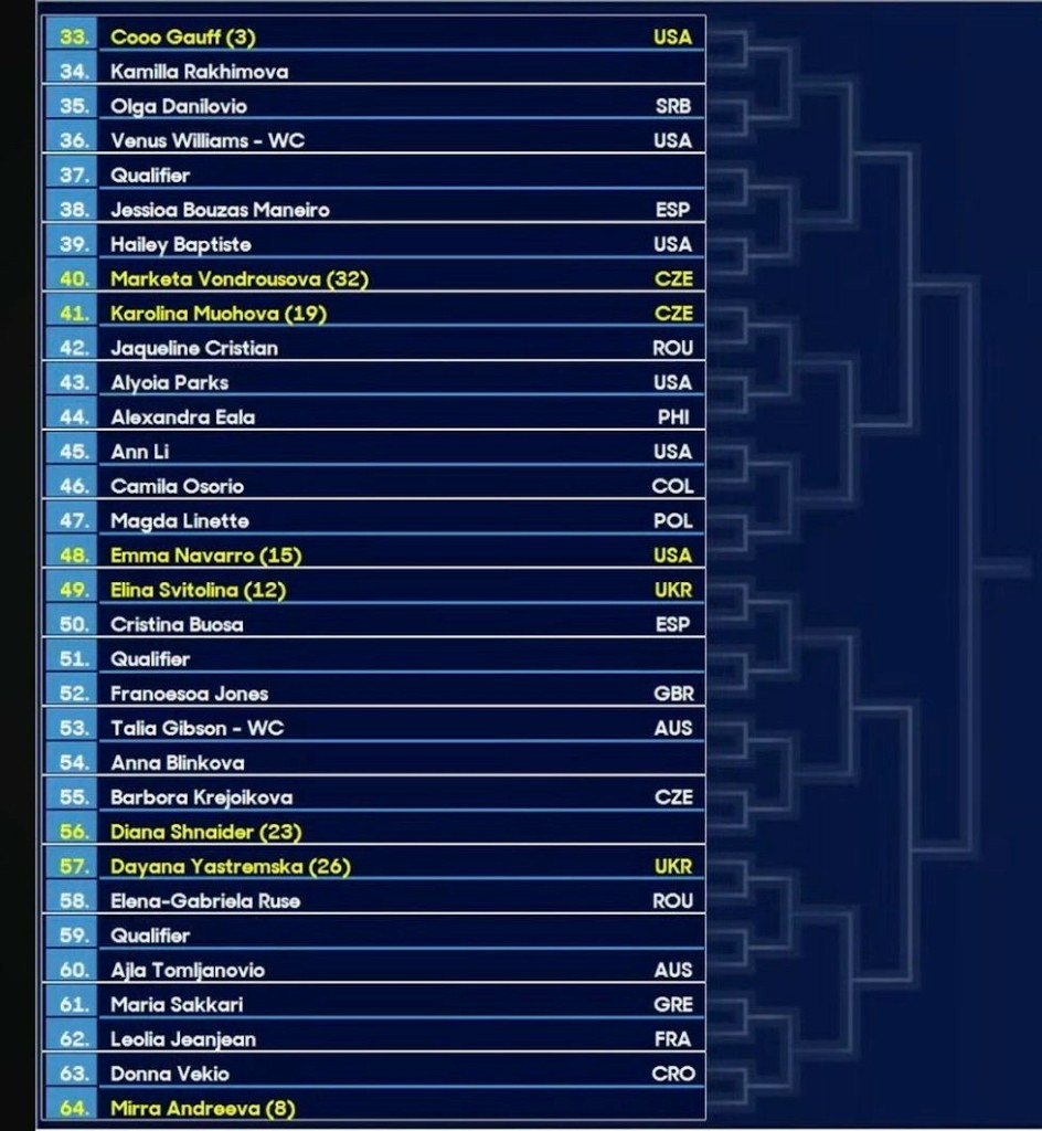 Στον τρίτο γύρο διασταυρώνεται με την Γιαστρέμσκα και στον 4ο με μία εκ των Σβιτολίνα και Σνάιντερ, ενώ στα προημιτελικά με την Κόκο Γκοφ και στα ημιτελικά με την Αρίνα Σαμπαλένκα.