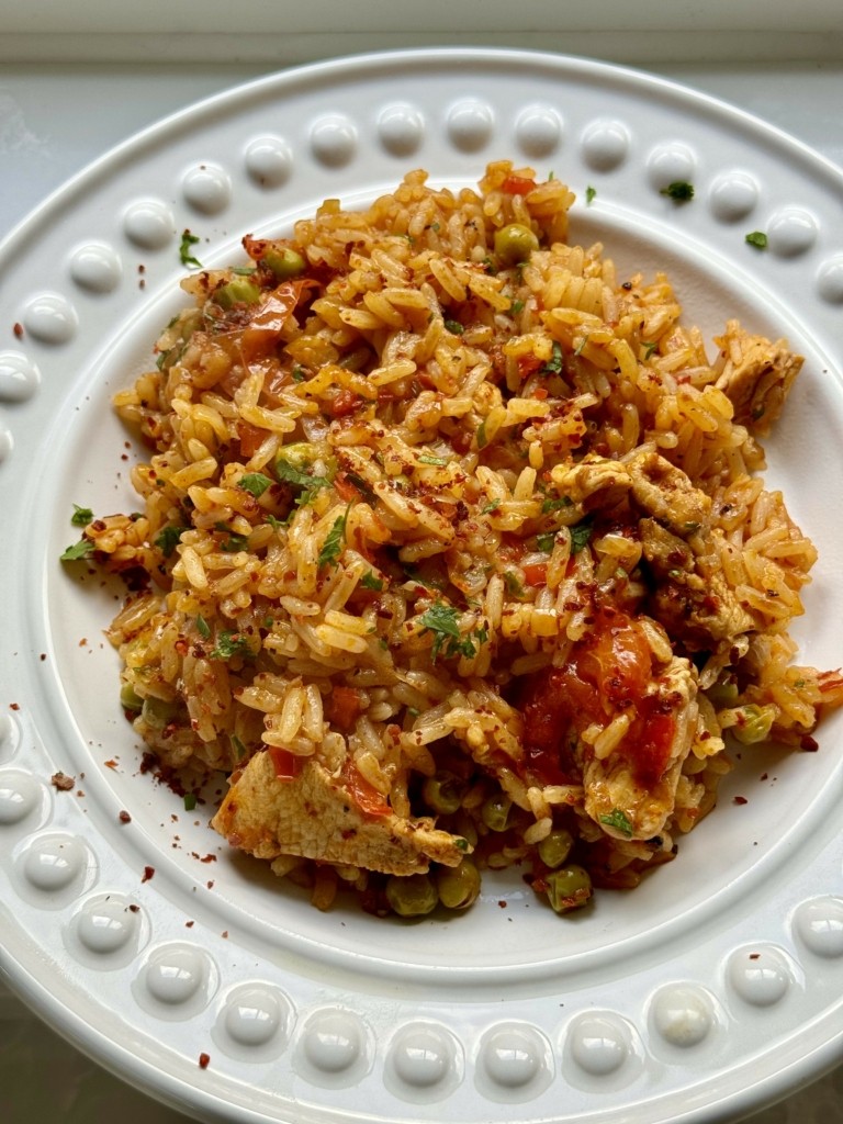 Ένα πανεύκολο και πεντανόστιμο πιάτο που ετοιμάζεται σε 30 λεπτά και σε ένα μόνο σκεύος, με μπουκίτσες από στήθος κοτόπουλου και σπυρωτό ρύζι μαγειρεμένα όλα μαζί μέσα σε αρωματική κόκκινη σάλτσα.