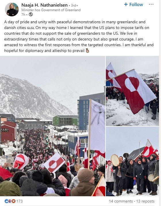 «Είμαι κατάπληκτη για τις πρώτες αντιδράσεις των χωρών που μπήκαν στο στόχαστρο. Είμαι ευγνώμων και γεμάτη ελπίδα πως η διπλωματία και οι συμμαχίες θα υπερισχύσουν», ανέφερε η υπουργός Ορυκτών Πόρων της Γροιλανδίας μέσω LinkedIn.