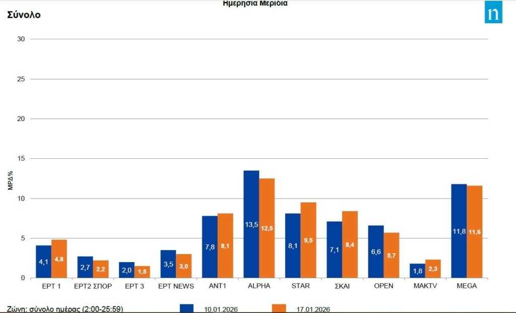 Με διαφορά «ανάσας» πρώτο το Mega στην κούρσα τηλεθέασης των καναλιών την Παρασκευή (16/1)