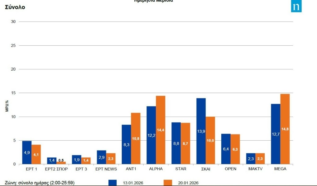 Ιδιαίτερο ενδιαφέρον παρουσιάζουν τα δεδομένα από τη χθεσινή δυναμομέτρηση της Nielsen για τους τηλεοπτικούς σταθμούς εθνικής εμβέλειας.