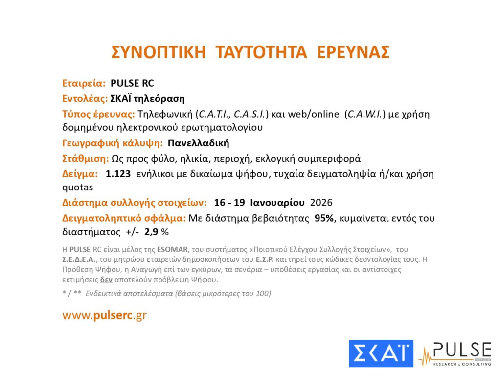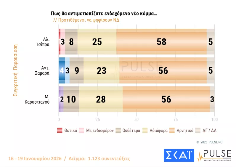 Τις απόψεις των πολιτών για τη διαφαινόμενη αλλαγή στο πολιτικό σκηνικό, με τα τρία «υπό κατασκευή» κόμματα, «μετράει» η δημοσκόπηση της Pulse, που παρουσιάστηκε στο κεντρικό δελτίο ειδήσεων του ΣΚΑΪ, στην οποία η Νέα Δημοκρατία καταγράφει κέρδη μισής μονάδας σε σχέση με τον Δεκέμβριο, στο 29,5%.