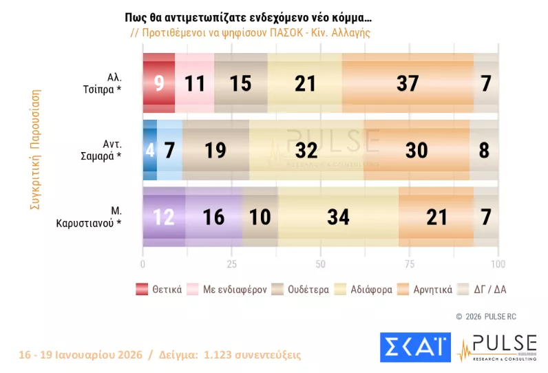 Η αποδοχή που τυγχάνει το «κόμμα» Καρυστιανού ανέρχεται στο 31% (θετικά και με ενδιαφέρον), ενώ του Αλέξη Τσίπρα είναι στο 19% και του Αντώνη Σαμαρά στο 10%.
