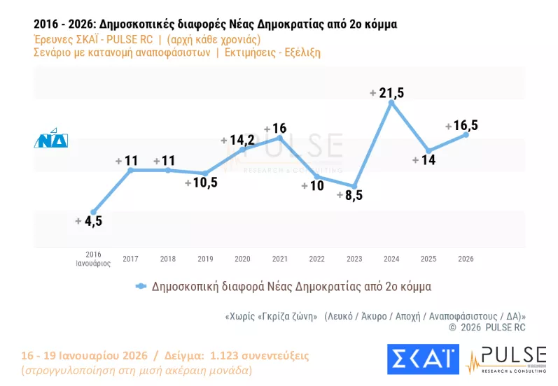 Η Pulse παρουσίασε έναν πίνακα με τις δημοσκοπικές διαφορές του κυβερνώντος κόμματος από το εκάστοτε δεύτερο κόμμα, από τον οποίον προκύπτει ότι η διαφορά των 16,5 μονάδων που έχει σήμερα στην εκτίμηση ψήφου, είναι η δεύτερη μεγαλύτερη από το 2016, όταν εξελέγη πρόεδρος της ΝΔ ο Κυριάκος Μητσοτάκης. Σημειώνεται ότι η μεγαλύτερη διαφορά είχε καταγραφεί το 2024.