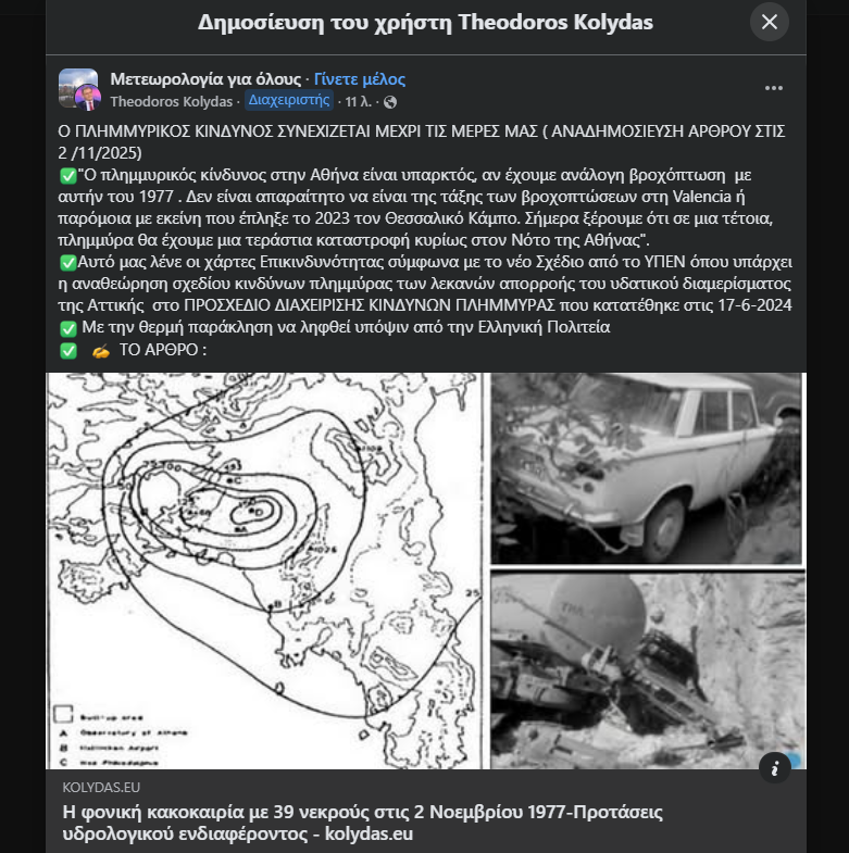 Με αναδημοσίευση παλαιότερου άρθρου του στην σελίδα του kolydas.gr – Μετεωρολογία και Κλίμα επισημαίνει ότι ο πλημμυρικός κίνδυνος στην Αθήνα είναι υπαρκτός, αν έχουμε ανάλογη βροχόπτωση με αυτήν του 1977. Δεν είναι απαραίτητο να είναι της τάξης των βροχοπτώσεων στη Valencia ή παρόμοια με εκείνη που έπληξε το 2023 τον Θεσσαλικό Κάμπο. Σήμερα ξέρουμε ότι σε μια τέτοια, πλημμύρα θα έχουμε μια τεράστια καταστροφή κυρίως στον Νότο της Αθήνας» τονίζει ο κ. Κολυδάς, μετά και την τεράστια καταστροφή στη Γλυφάδα από την κακοκαιρία της Τετάρτης.