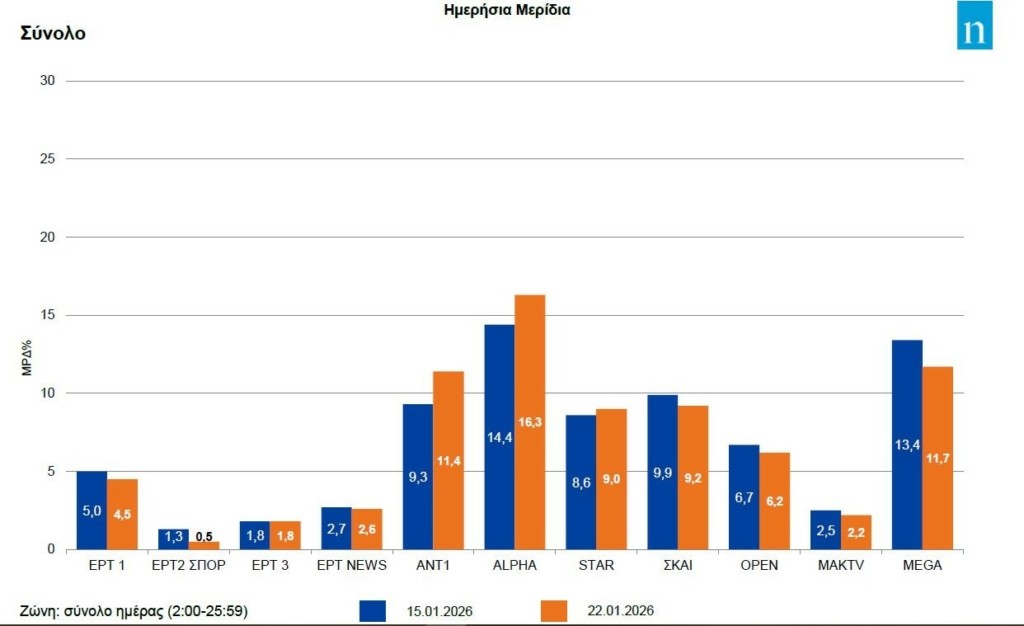 Κατά τα λοιπά, με εξαίρεση τη μεταβολή του μεριδίου της ΕΡΤ2ΣΠΟΡ στις διαστάσεις που είχε την Τρίτη, στον υπόλοιπο ανταγωνισμό δεν καταγράφηκαν δραματικές ανακατατάξεις, με βάση τα στοιχεία της Nielsen.