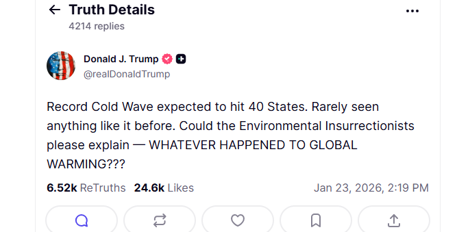 «Ένα κύμα ψύχους ρεκόρ αναμένεται να πλήξει 40 πολιτείες. Σπάνια έχουμε ξαναδεί κάτι τέτοιο. Άραγε οι επαναστάτες του περιβάλλοντος θα μπορούσαν να μου εξηγήσουν: Τι συνέβη με την κλιματική αλλαγή;», έγραψε ο Αμερικανός πρόεδρος.