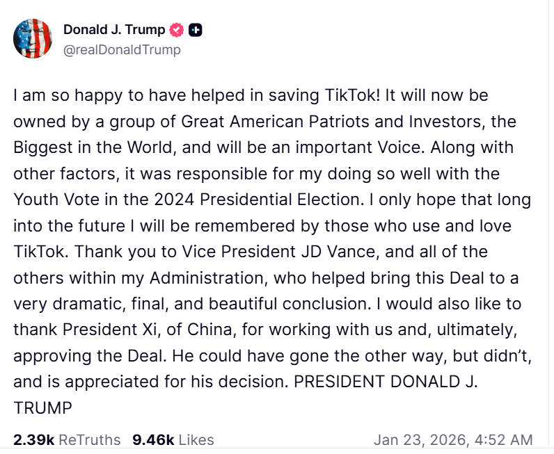 Ο Τραμπ είχε αναβάλει επανειλημμένα την καταληκτική προθεσμία για την συμμόρφωση του TikTok με την αμερικανική νομοθεσία. Η τελευταία διορία που είχε δοθεί στην πλατφόρμα έληγε σήμερα. Το κοινωνικό δίκτυο είχε ανακοινώσει τον Δεκέμβριο ότι υπέγραψε συμφωνία που επιτρέπει τη δημιουργία της αμερικανικής κοινοπραξίας, όπως απαιτεί ο νόμος.