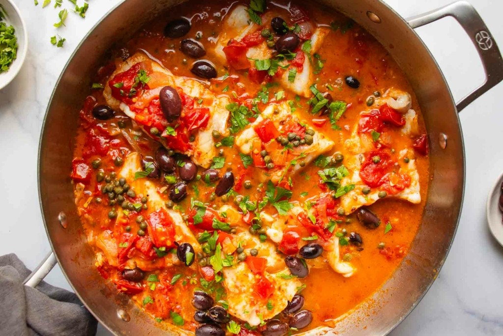 Ετοιμάζεται εύκολα με πατάτες και ντομάτες ενώ η προσθήκη των ελιών και της κάπαρης τον κάνει ακόμα πιο γευστικό και προσθέτει αυτή τη μεσογειακή πινελιά που δίνει σε αυτόν τον μπακαλιάρο τ’ όνομά του.