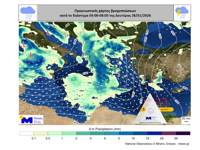 Σύμφωνα με τα διαθέσιμα προγνωστικά στοιχεία του Εθνικού Αστεροσκοπείου Αθηνών / Meteo.gr, τη Δευτέρα 26/01 αναμένονται ισχυρές βροχές και καταιγίδες στα δυτικά, σταδιακά στην Ανατολική Στερεά, στη Νότια και Ανατολική Πελοπόνησο, στην Εύβοια, στην Κεντρική και Ανατολική Στερεά, από τις προμεσημβρινές ώρες στην Κρήτη, στις Κυκλάδες από το μεσημέρι στις Σποράδες, στα νησιά του Βόρειου και Ανατολικού Αιγαίου και στα Δωδεκάννησα.