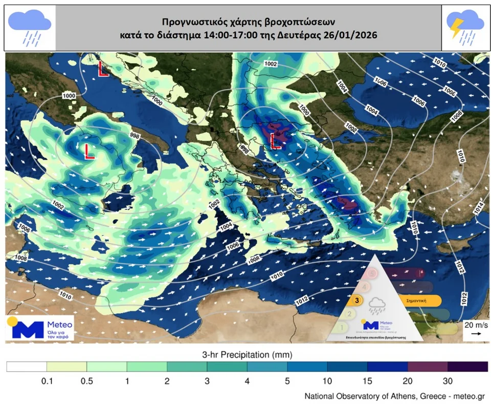 Σύμφωνα με τα διαθέσιμα προγνωστικά στοιχεία του Εθνικού Αστεροσκοπείου Αθηνών / Meteo.gr, τη Δευτέρα 26/01 αναμένονται ισχυρές βροχές και καταιγίδες στα δυτικά, σταδιακά στην Ανατολική Στερεά, στη Νότια και Ανατολική Πελοπόννησο, στην Εύβοια, στην Κεντρική και Ανατολική Στερεά, από τις προμεσημβρινές ώρες στην Κρήτη, στις Κυκλάδες από το μεσημέρι στις Σποράδες, στα νησιά του Βόρειου και Ανατολικού Αιγαίου και στα Δωδεκάνησα.