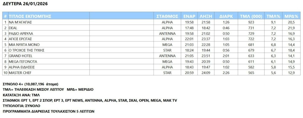 Δια περιπάτου πρώτος σε τηλεθέαση ο Alpha (και) τη Δευτέρα (26/1)
