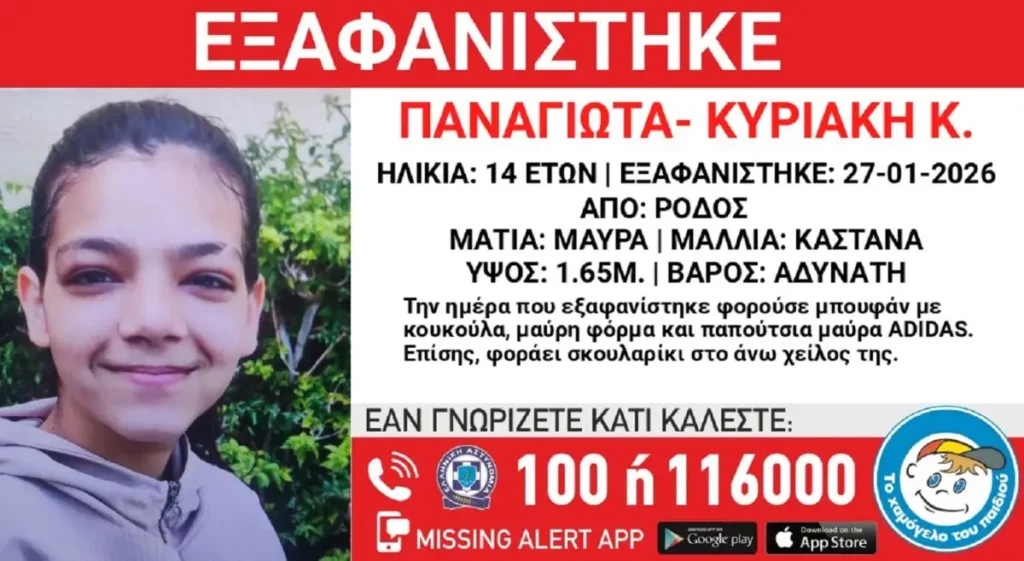 Συναγερμός έχει σημάνει στη Ρόδο για την εξαφάνιση ενός 14χρονου κοριτσιού, με το «Χαμόγελο του Παιδιού» να ενημερώνεται σχετικά και να προχωρά στη δημοσιοποίηση των στοιχείων της.