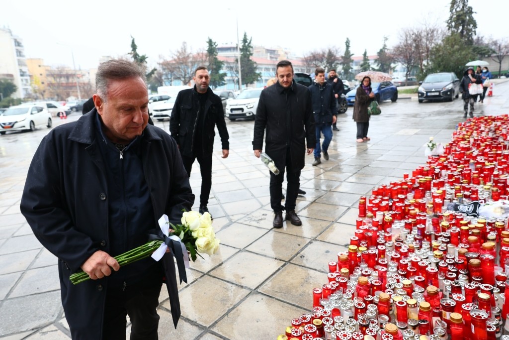 Ο κ. Αγγελούδης, συνοδευόμενος από τον αντιδήμαρχο Ψηφιακής Πολιτικής, Διοικητικής Αναδιάρθρωσης και Εξυπηρέτησης του Πολίτη και πρόεδρο της επιτροπής για τα 100 χρόνια του ΠΑΟΚ, Κώστα Βασιλόπουλο, τον αντιδήμαρχο Μέριμνας για την Τρίτη Ηλικία, Κοινοτήτων και Δημοτικών Αποκέντρωσης, Παντελή Καζαντζίδη, τον δημοτικό σύμβουλο και πρώην άσο του Δικεφάλου, Γιώργο Τουρσουνίδη, τον δημοτικό σύμβουλο και πρώην ποδοσφαιριστή του Άρη, Σάκη Πρίττα και τον πρώην μπασκετμπολίστα που τίμησε τα ασπρόμαυρα χρώματα και μέλος της δημοτικής του παράταξης, Γιάννη Γιαννούλη, άφησε τα λουλούδια σε ένδειξη πένθους και σεβασμού προς τους επτά νεκρούς και τους τρεις τραυματίες.