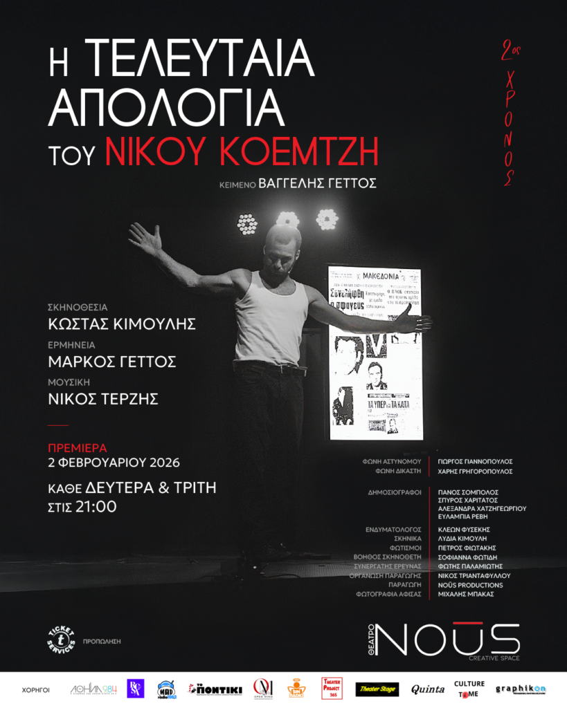 Προπώληση εισιτηρίων: Ticketservices.gr https://www.ticketservices.gr/event/i-teleutaia-apologia-tou-nikou-koemtzi-theatro-nous/