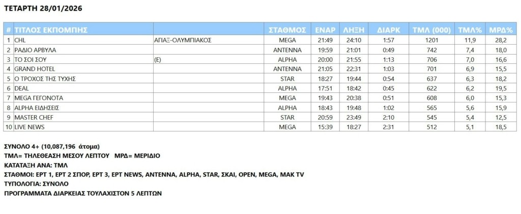 Η απευθείας μετάδοση του αγώνα Άγιαξ-Ολυμπιακού για το CHL είχε -προφανώς- την υψηλότερη τηλεθέαση από κάθε άλλο πρόγραμμα της προηγούμενης ημέρας, και με διαφορά από το δεύτερο σε δημοφιλία «Ράδιο αρβύλα».