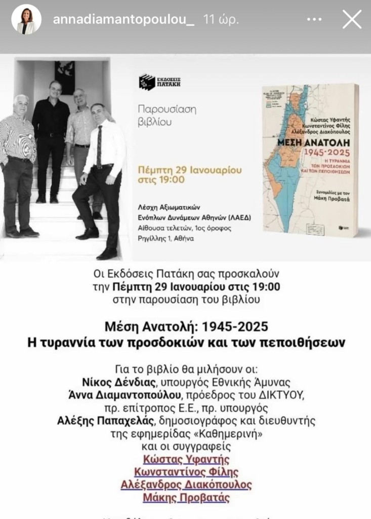 Για το βιβλίο μίλησαν ο υπουργός Άμυνας, Νίκος Δένδιας, ο δημοσιογράφος, διευθυντής της «Καθημερινής», Αλέξης Παπαχελάς, και η Άννα Διαμαντοπούλου, η οποία στην πρόσκληση του εκδοτικού οίκου παρουσιάζεται ως «πρόεδρος του ΔΙΚΤΥΟΥ, πρώην Επίτροπος ΕΕ και πρώην υπουργός».