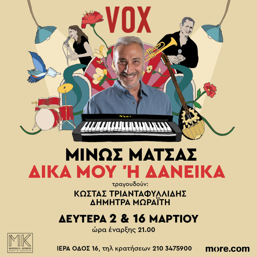 Ο Μίνως Μάτσας έρχεται στη σκηνή του VOX, σ΄ έναν από τους πιο σύγχρονους και φιλόξενους χώρους της Αθήνας, για δύο μοναδικές μουσικές βραδιές με τίτλο «Δικά μου ή Δανεικά», τις Δευτέρες 2 & 16 Μαρτίου.