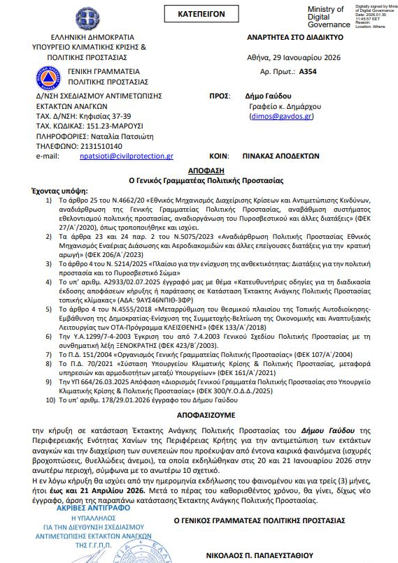 την κήρυξη σε κατάσταση Έκτακτης Ανάγκης Πολιτικής Προστασίας του Δήμου Γαύδου της Περιφερειακής Ενότητας Χανίων της Περιφέρειας Κρήτης για την αντιμετώπιση των εκτάκτων αναγκών και την διαχείριση των συνεπειών που προέκυψαν από έντονα καιρικά φαινόμενα (ισχυρές βροχοπτώσεις, θυελλώδεις άνεμοι), τα οποία εκδηλώθηκαν στις 20 και 21 Ιανουαρίου 2026 στην ανωτέρω περιοχή, σύμφωνα με το ανωτέρω 10 σχετικό.