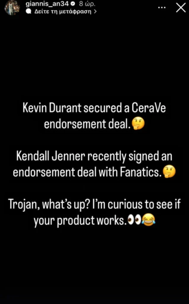 Χρησιμοποιώντας ως παράδειγμα τον Κέβιν Ντουράντ και το deal που έκανε με την εταιρεία περιποίησης «CeraVe», αλλά και την Κένταλ Τζένερ, που πρόσφατα συνεργάστηκε με την εταιρεία ρούχων «Fanatics» προκαλώντας σάλο με τη διαφήμισή της και την καυστική/ χιουμοριστική αναφορά στις σχέσεις της με παίκτες του NBA, ρώτησε την εταιρεία προφυλακτικών «Trojan» αν… δουλεύουν τα προϊόντα της.