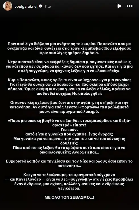 Ευχαριστώ λοιπόν και τη Σίσσυ και τον Νίκο και όλους όσοι είπαν το αυτονόητο… Και για να τελειώνουμε, το πραγματικά σύγχρονο -και παντελονάτο- είναι να λες «συγγνώμη» όταν έχεις προσβάλει έναν άνθρωπο, μια σχέση, πολλές γυναίκες και ανθρώπους γενικότερα. ΜΕ ΟΛΟ ΤΟΝ ΣΕΒΑΣΜΟ».