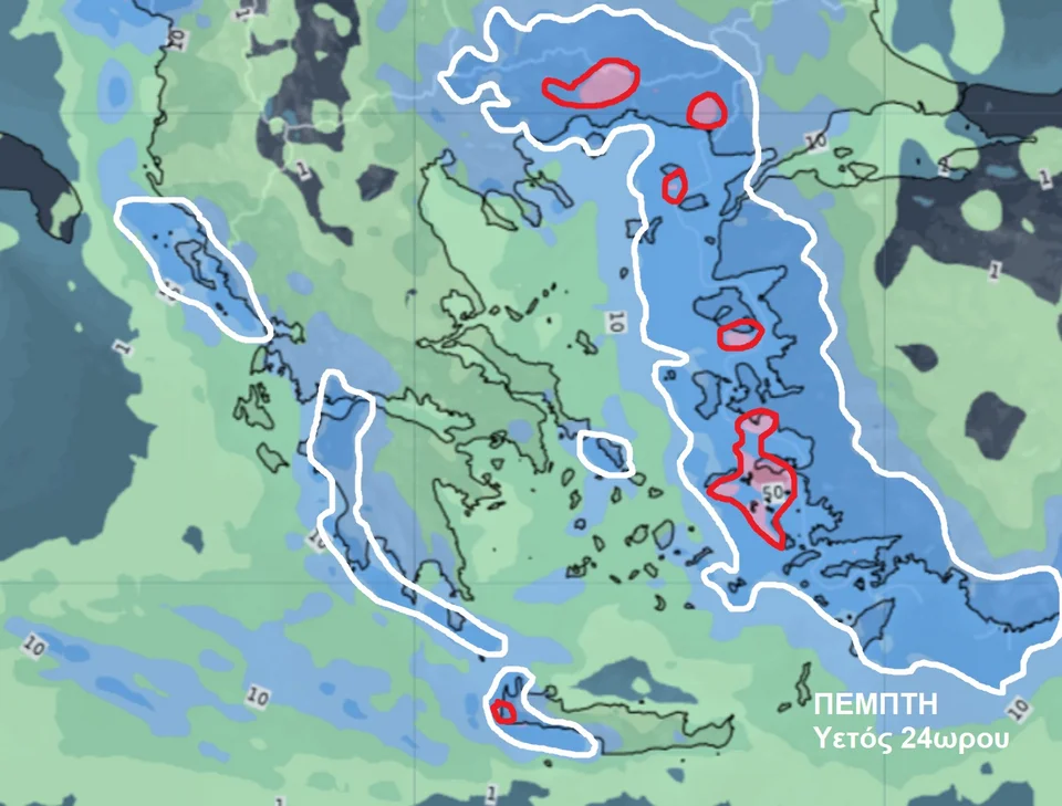 Σκούρο μπλε: Κατά περιόδους ισχυρές και ίσως γενικευμένες βροχές, με πιθανότητα τοπικών πλημμυρικών φαινομένων