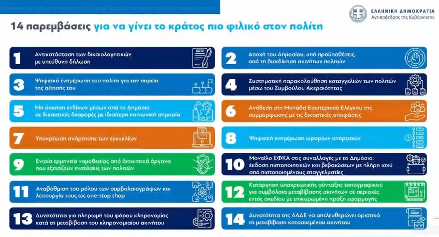 Το νομοσχέδιο με τίτλο «Παρεμβάσεις για ένα κράτος πιο φιλικό στους πολίτες» περιλαμβάνει μεταξύ άλλων: