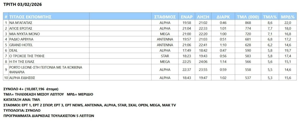 Η χθεσινή ημέρα δεν ήταν καλή – σε συγκέντρωση τηλεθεατών, άρα και επιδόσεις εκπομπών – όπως η Δευτέρα. Παρά την γενική καθίζηση της τηλεθέασης η σειρά «Να μ’ αγαπάς» παρέμεινε κορυφαία προτίμηση των τηλεθεατών, οι οποίοι ώθησαν τον «Άγιο έρωτα» στην δεύτερη θέση, στην οποία την ακριβώς προηγούμενη ημέρα είχε «σκαρφαλώσει» η σατιρική εκπομπή «Ράδιο αρβύλα», η εκπομπή της οποίας υποχώρησε δύο θέσεις στο ημερήσιο τηλεβαρόμετρο από τη μία ημέρα στην άλλη.