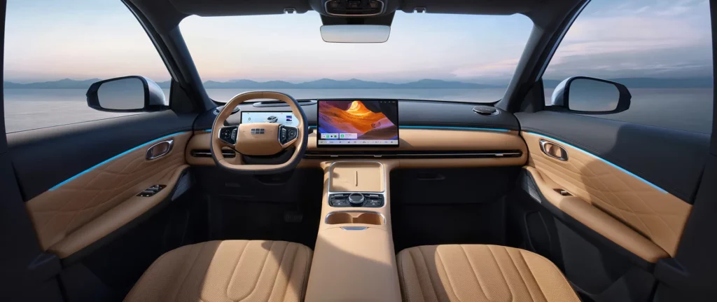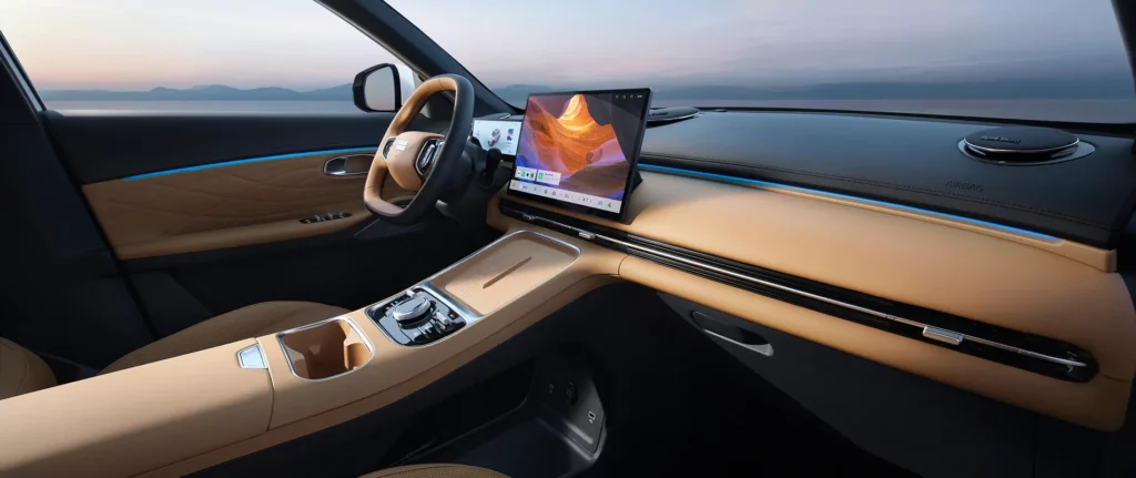 Στο εσωτερικό προσφέρει ποιοτική και εκλεπτυσμένη καμπίνα, με ανώτερη ποιότητα υλικών και άνεση που χαρακτηρίζει ένα premium SUV. Τα υλικά είναι μαλακά με καλή συναρμογή, ενώ τα πάντα μέσα την καμπίνα έχουν εργονομική φιλοσοφία. Η κεντρική κονσόλα με σχεδιασμό γέφυρας και ενσωματωμένο αποθηκευτικό χώρο διατηρεί την αίσθηση χώρου και λειτουργικότητας. Ανάλογα με την έκδοση, τα εμπρόσθια καθίσματα διαθέτουν αερισμό, σύστημα μασάζ και μνήμη, η καμπίνα φωτίζεται από ατμοσφαιρικό φωτισμό 256 χρωμάτων, ενώ τα υψηλής ποιότητας υλικά δημιουργούν εκλεπτυσμένη ατμόσφαιρα. Το εσωτερικό συμπληρώνεται από 15,4 ιντσών κεντρική οθόνη και τον 10,2 ιντσών πλήρως ψηφιακό πίνακα οργάνων. Υπάρχει και ηχοσύστημα Flyme Sound 16 ηχείων με 1000 W, ψηφιακό ενισχυτή και αποκλειστικά ηχεία προσκέφαλων.