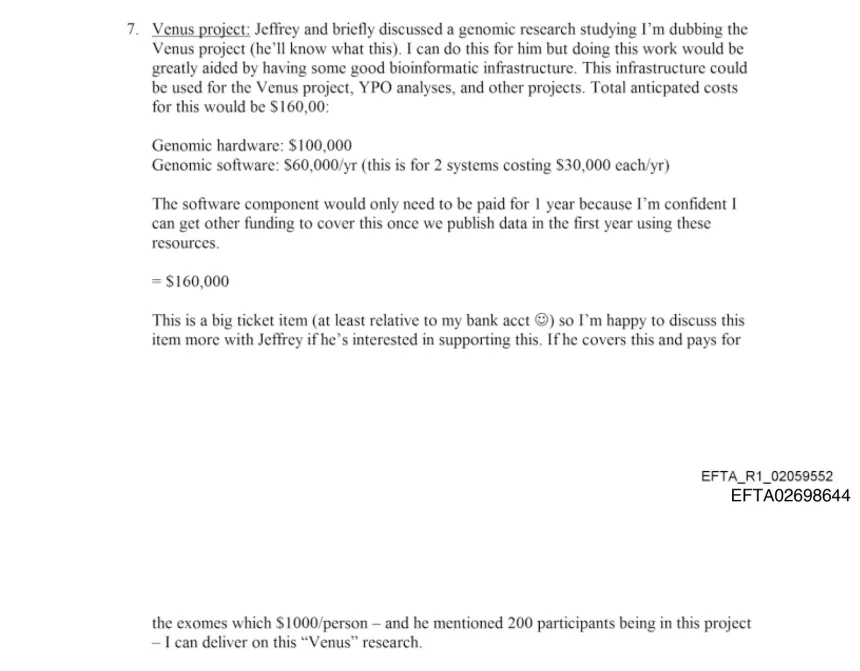 «Ο Τζέφρι και εγώ συζητήσαμε εν συντομία μια γονιδιωματική έρευνα την οποία ονομάζω Venus project (θα ξέρει τι είναι αυτό)», έγραψε ο Τακούρια στο τιμολόγιο του Ιουνίου 2014. «Μπορώ να το κάνω αυτό για αυτόν, αλλά η εκτέλεση αυτής της εργασίας θα βοηθούσε πολύ αν υπήρχε κάποια καλή βιοπληροφορική υποδομή».
