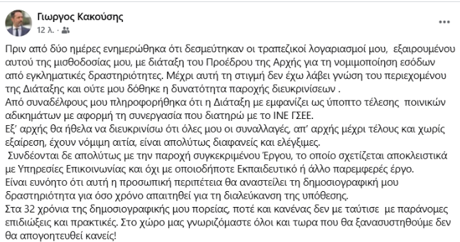 Ο Κακούσης υποστηρίζει ότι ενημερώθηκε από συναδέλφους του πως εμφανίζεται ως ύποπτος για ποινικά αδικήματα με αφορμή συνεργασία του με το ΙΝΕ της ΓΣΕΕ και πως,, ως νωρίς το απόγευμα της Παρασκευής(6/2), δεν είχε λάβει γνώση του περιεχομένου της Διάταξης του Προέδρου της Αρχής για τη Νομιμοποίηση Εσόδων από εγκληματικές ενέργειες, ούτε και του δόθηκε η δυνατότητα παροχής διευκρινίσεων.