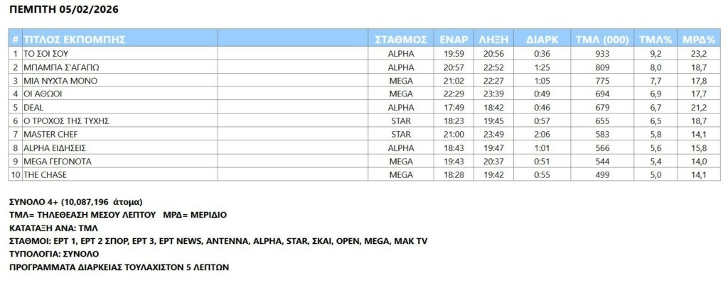 Σε άλλα αξιοπρόσεκτα, το πέρασμα του «Masterchef» στην έβδομη θέση και η παραμονή του «The chase» στη 10άδα.